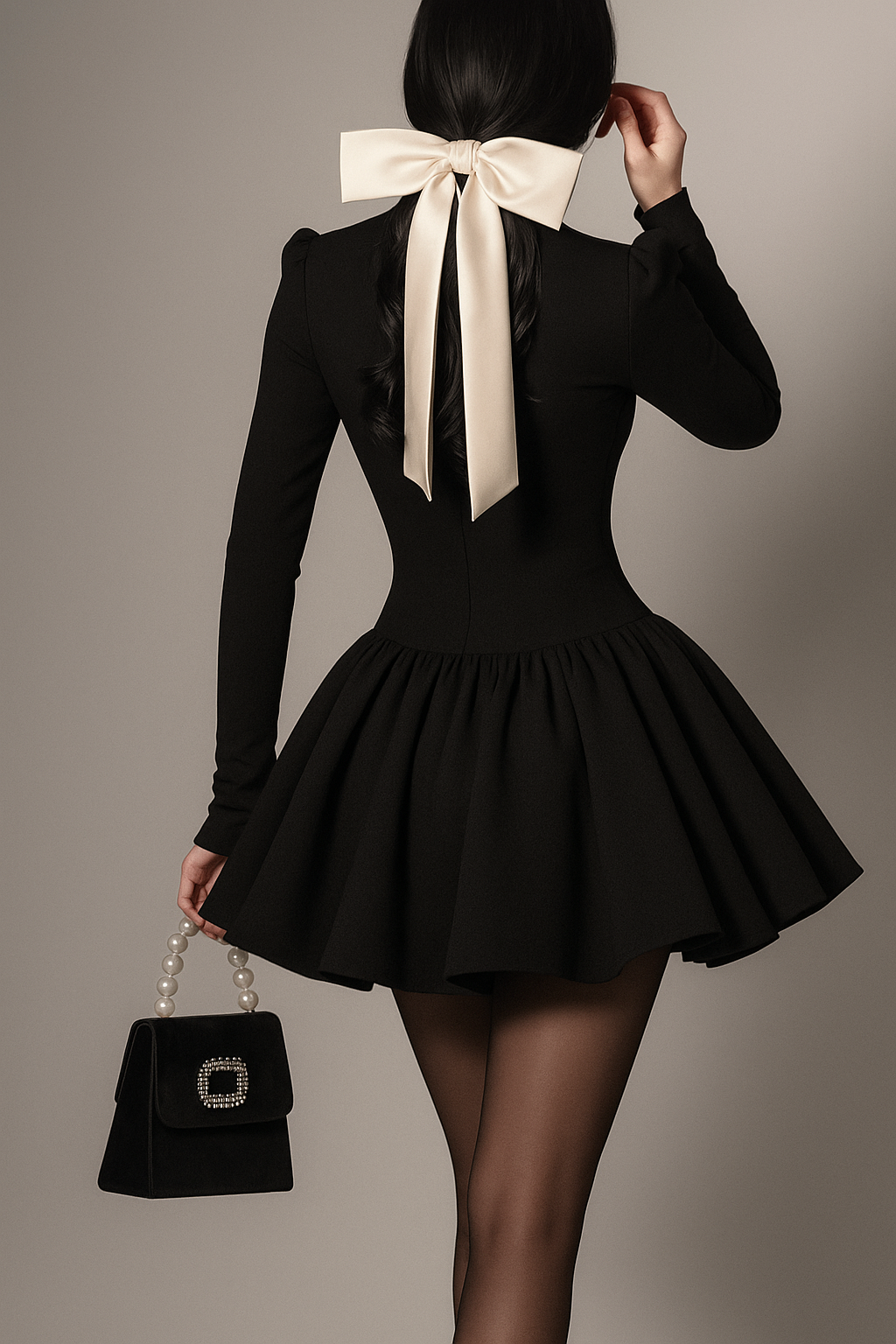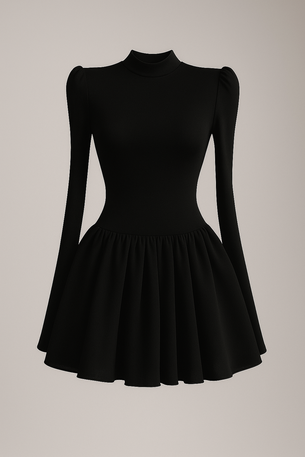 Siyah Mini Abiye Elbise Uzun Kol Dik Yaka