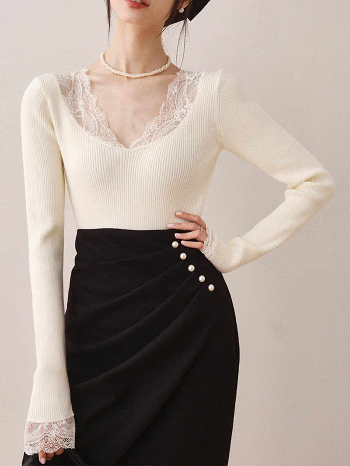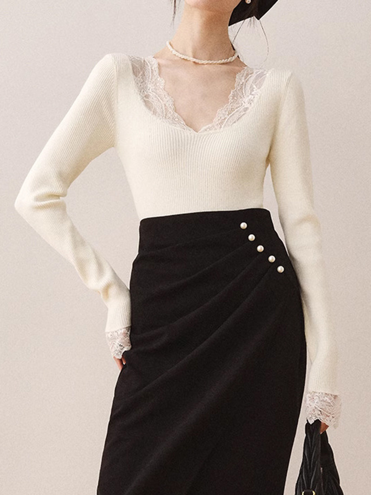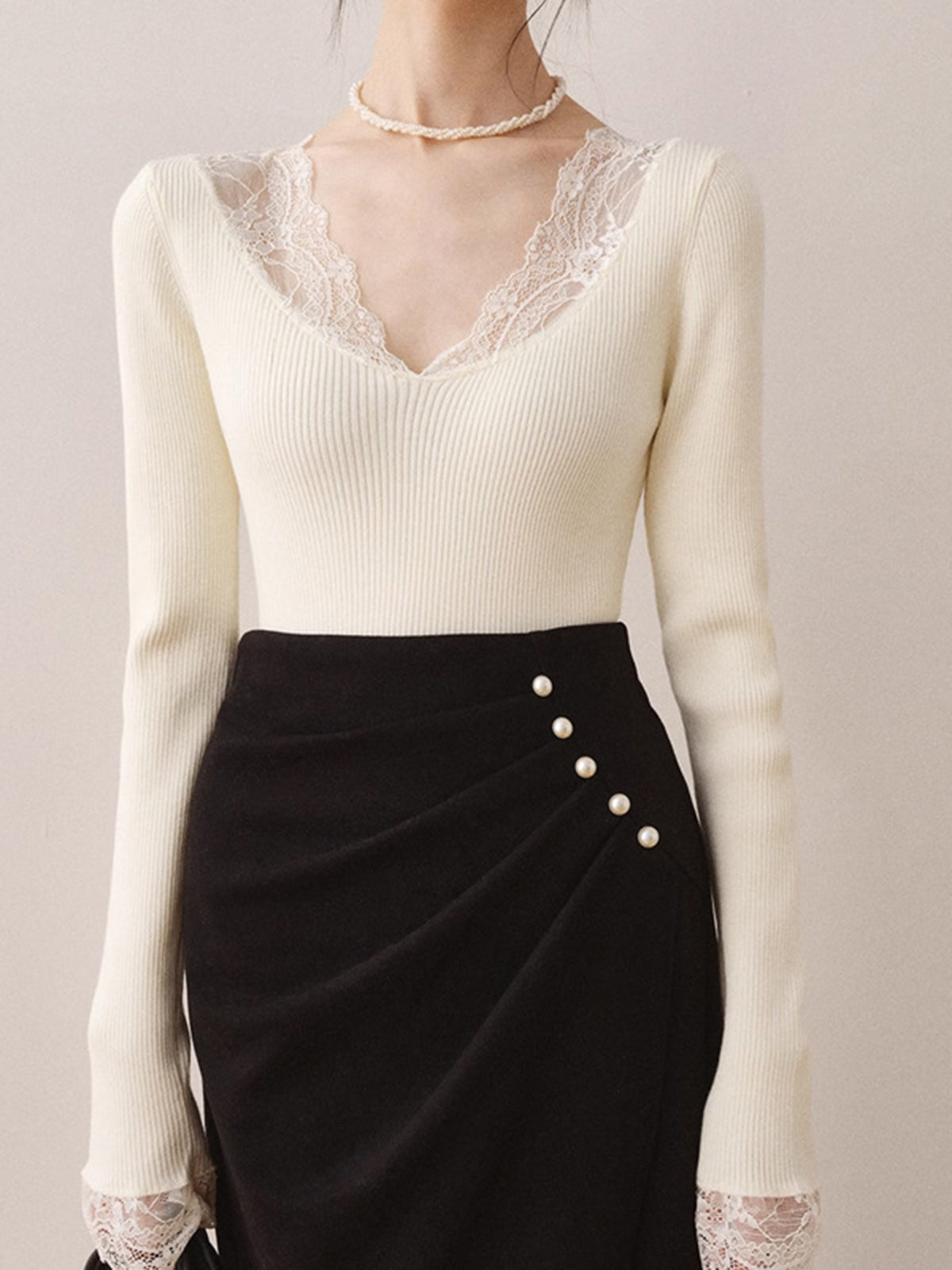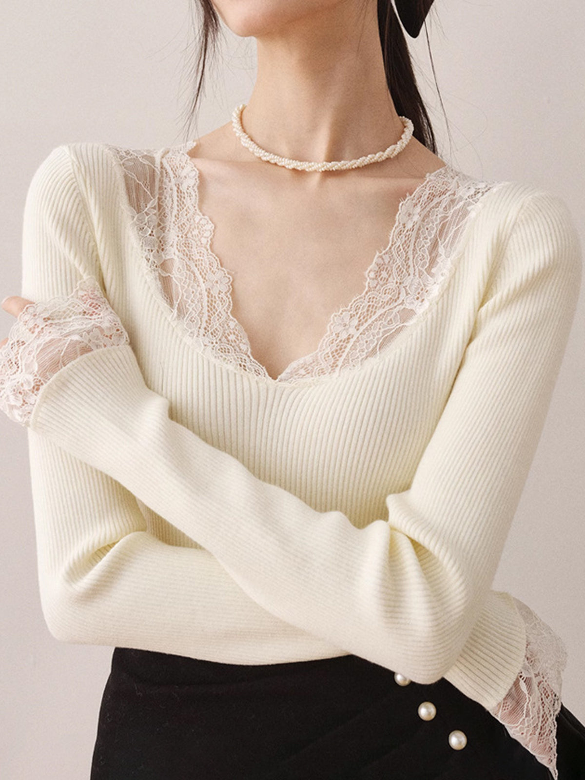 Dantel Detaylı Triko Bluz Uzun Kollu Ekru V Yaka