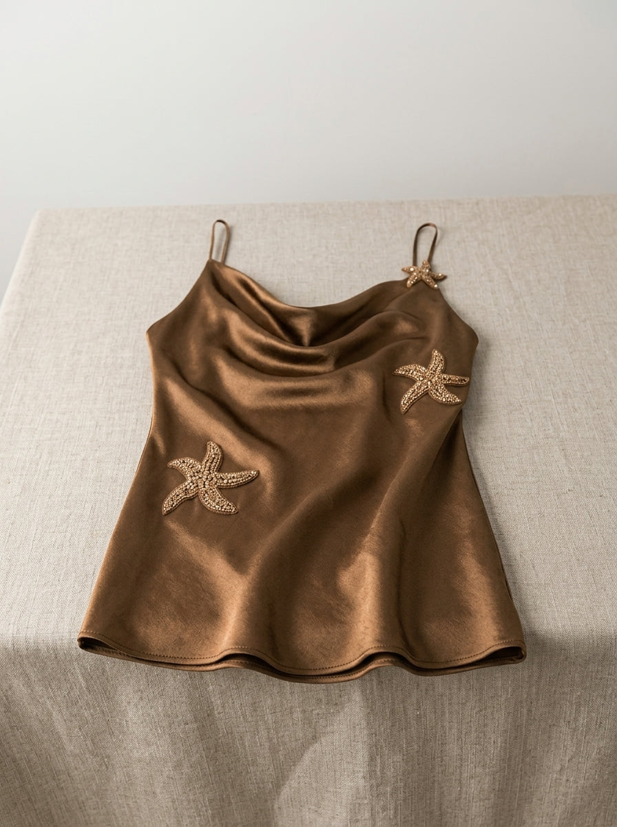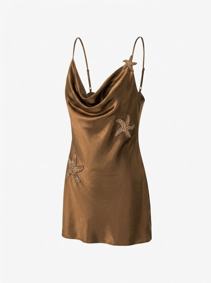 Kolsuz Fırfırlı Mini Elbise Kare Yaka Denizyıldızı Desenli Kahverengi