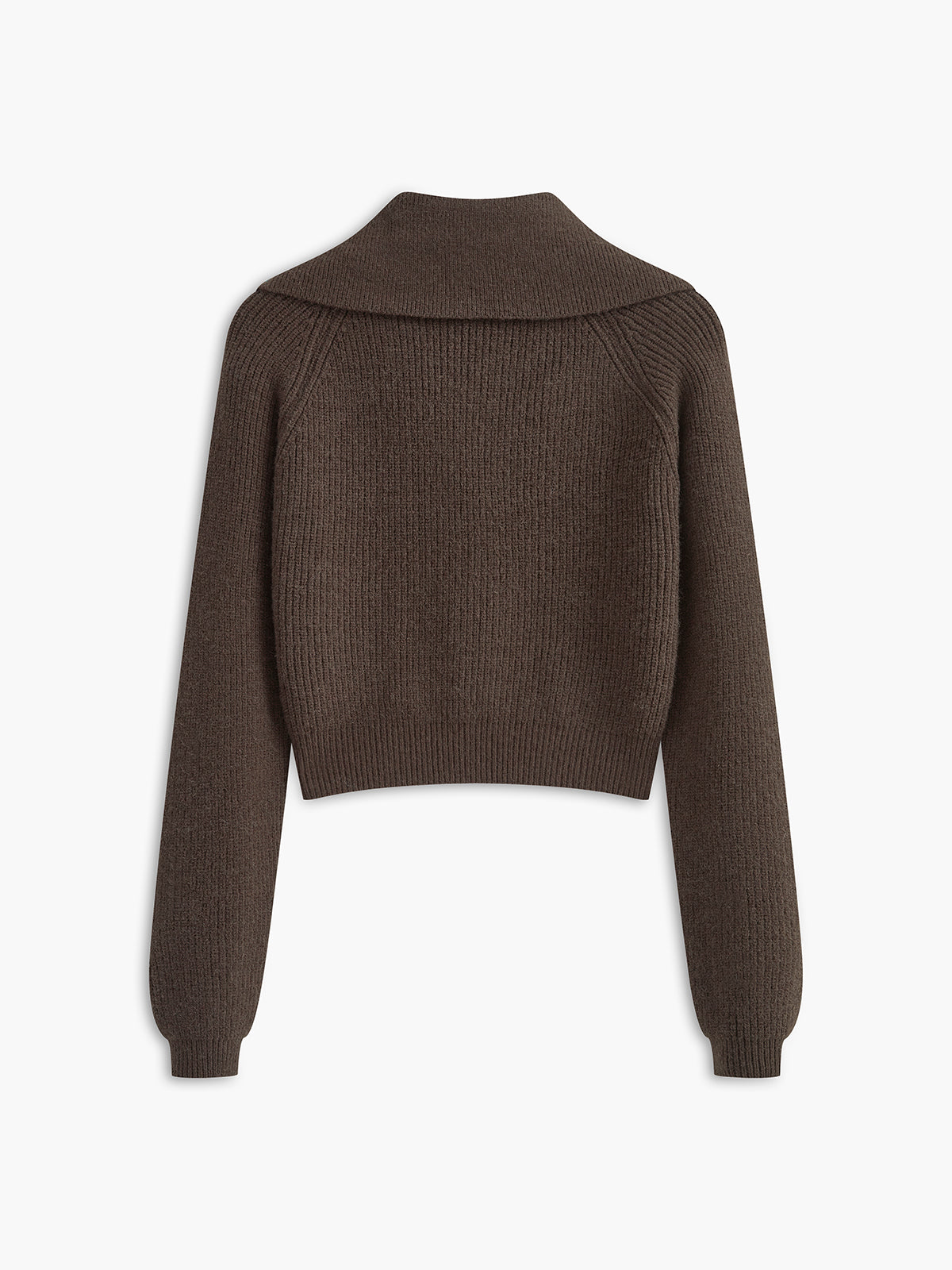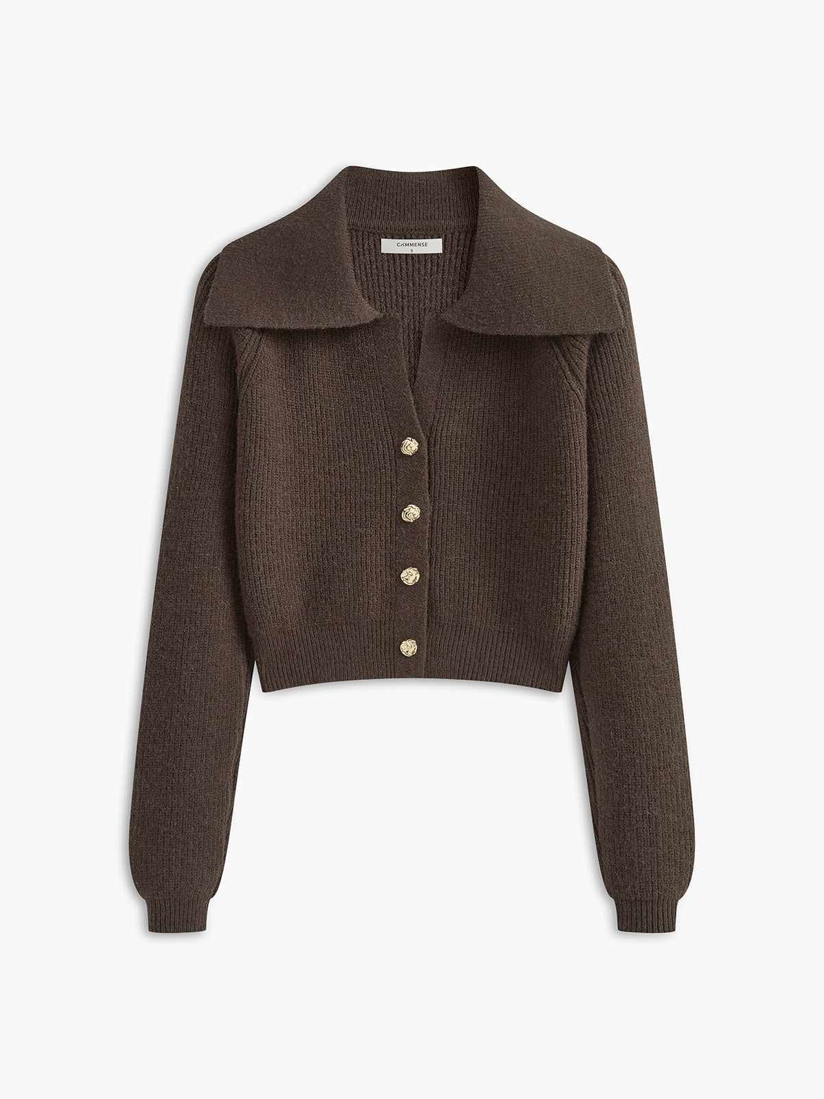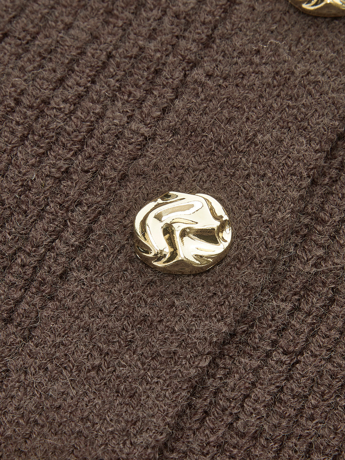 Düğmeli Yakalı Kısa Triko Hırka Koyu Kahverengi Metal Detaylı