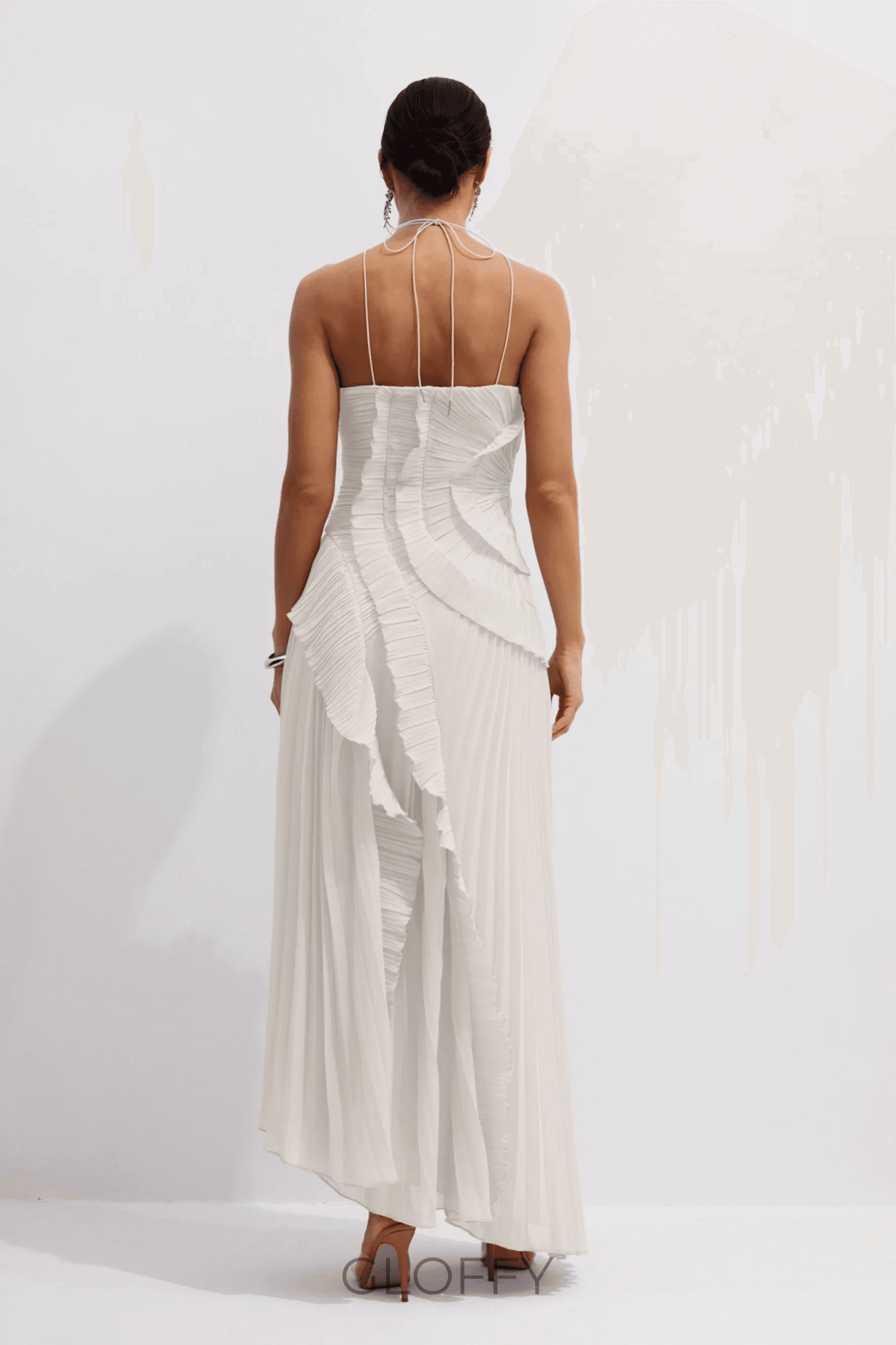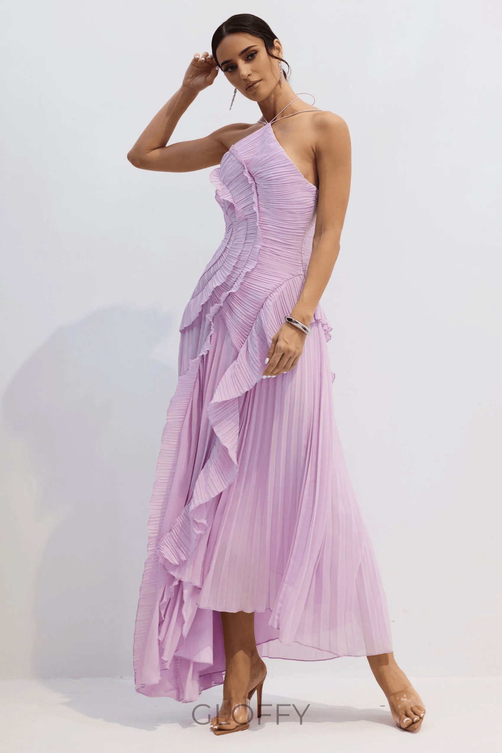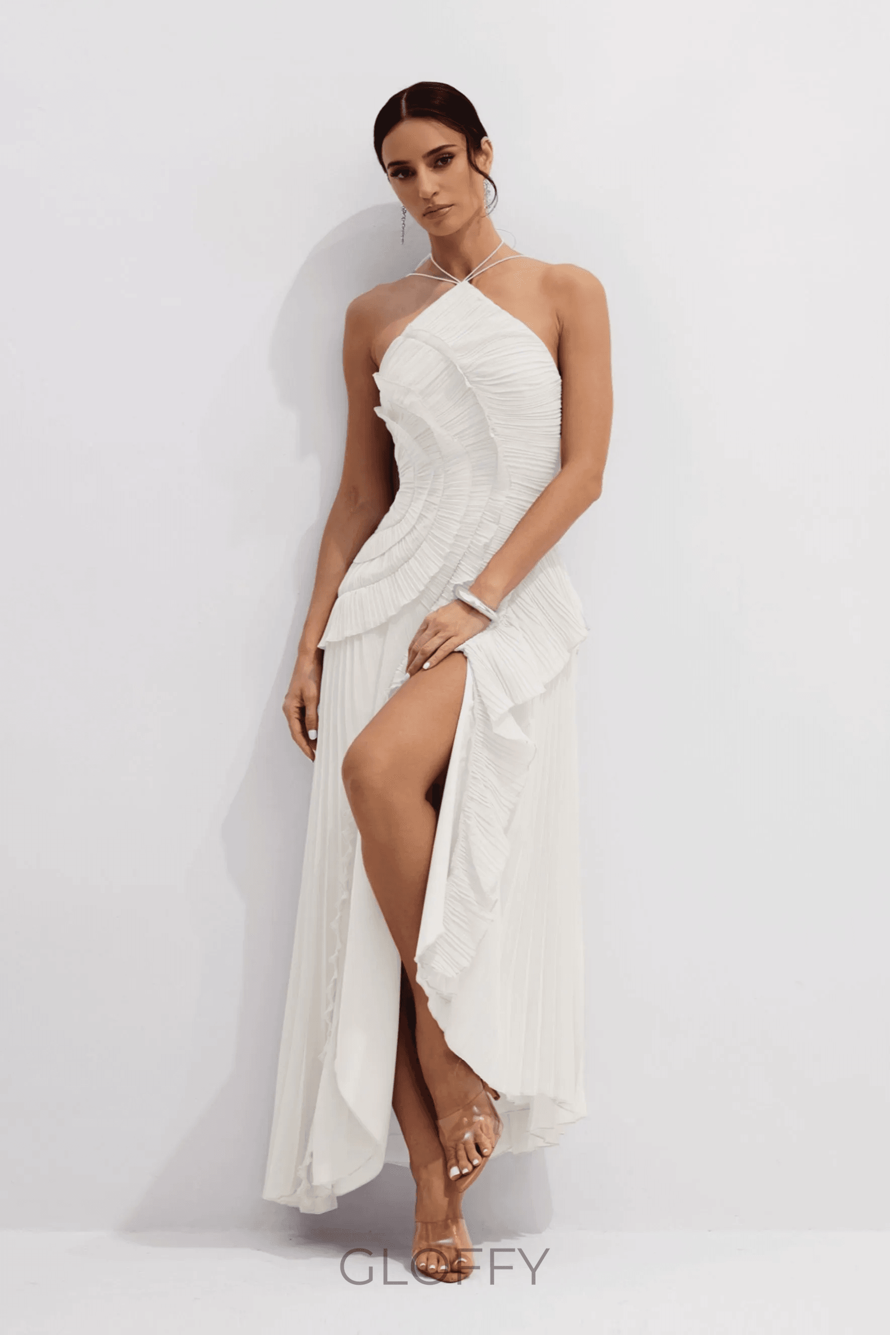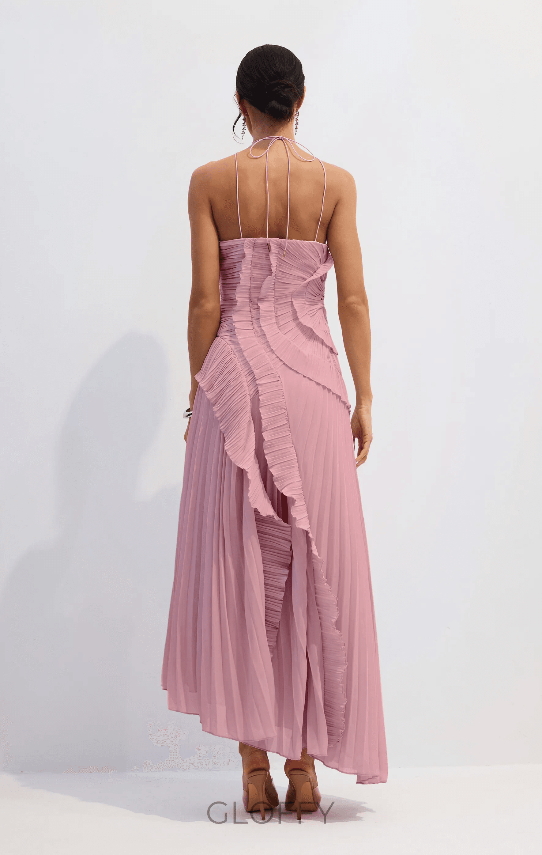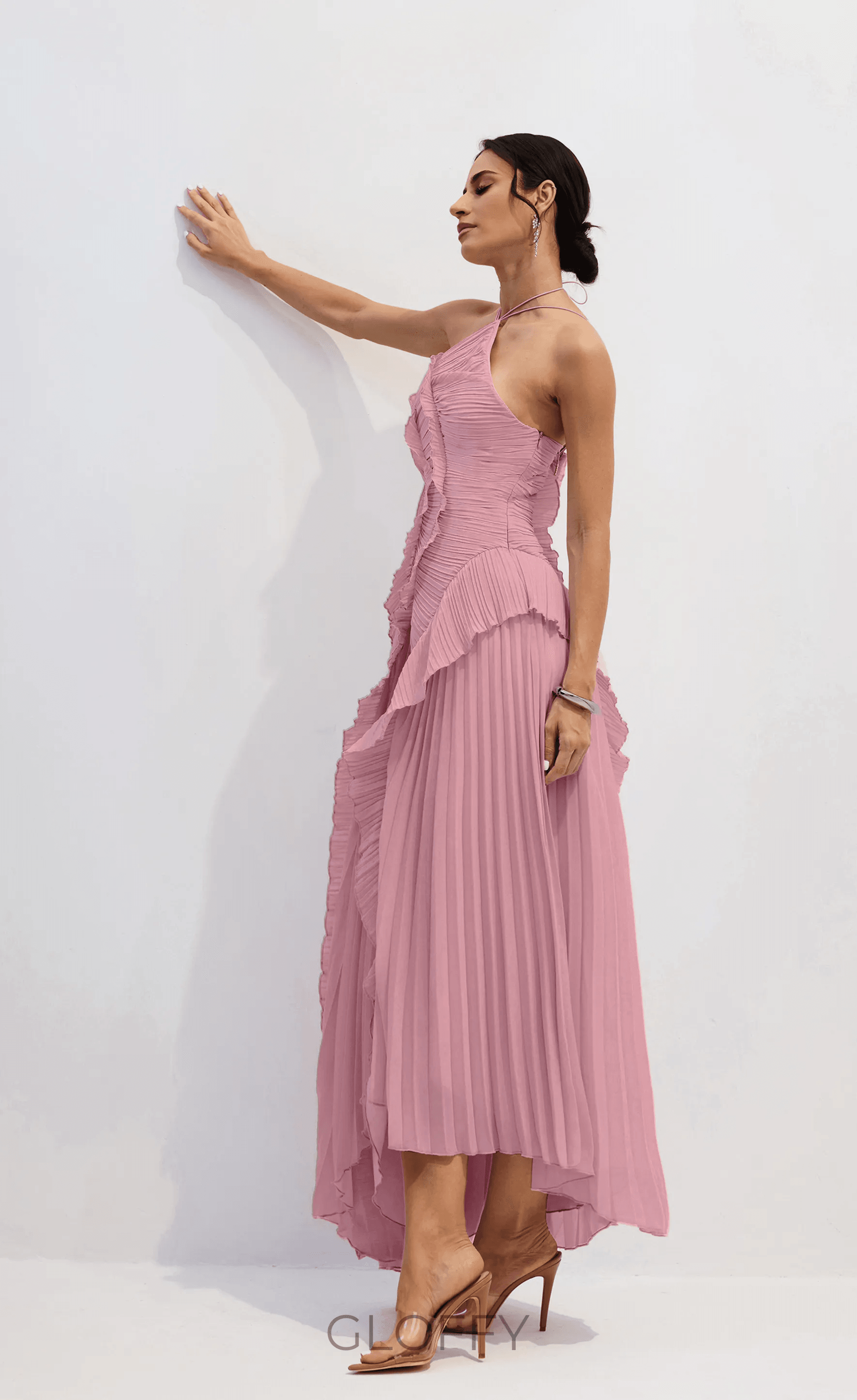 Velimora Asimetrik Pliseli Halter Yaka Yırtmaçlı Midi Elbise