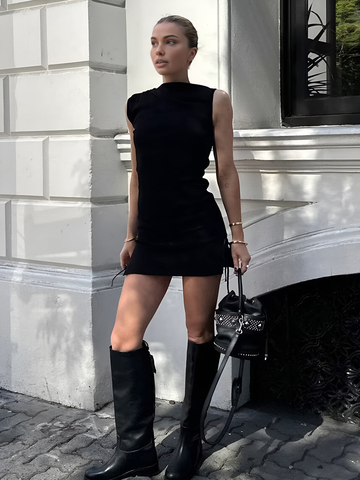 İpli Detaylı Asimetrik Yaka Kısa Elbise Siyah