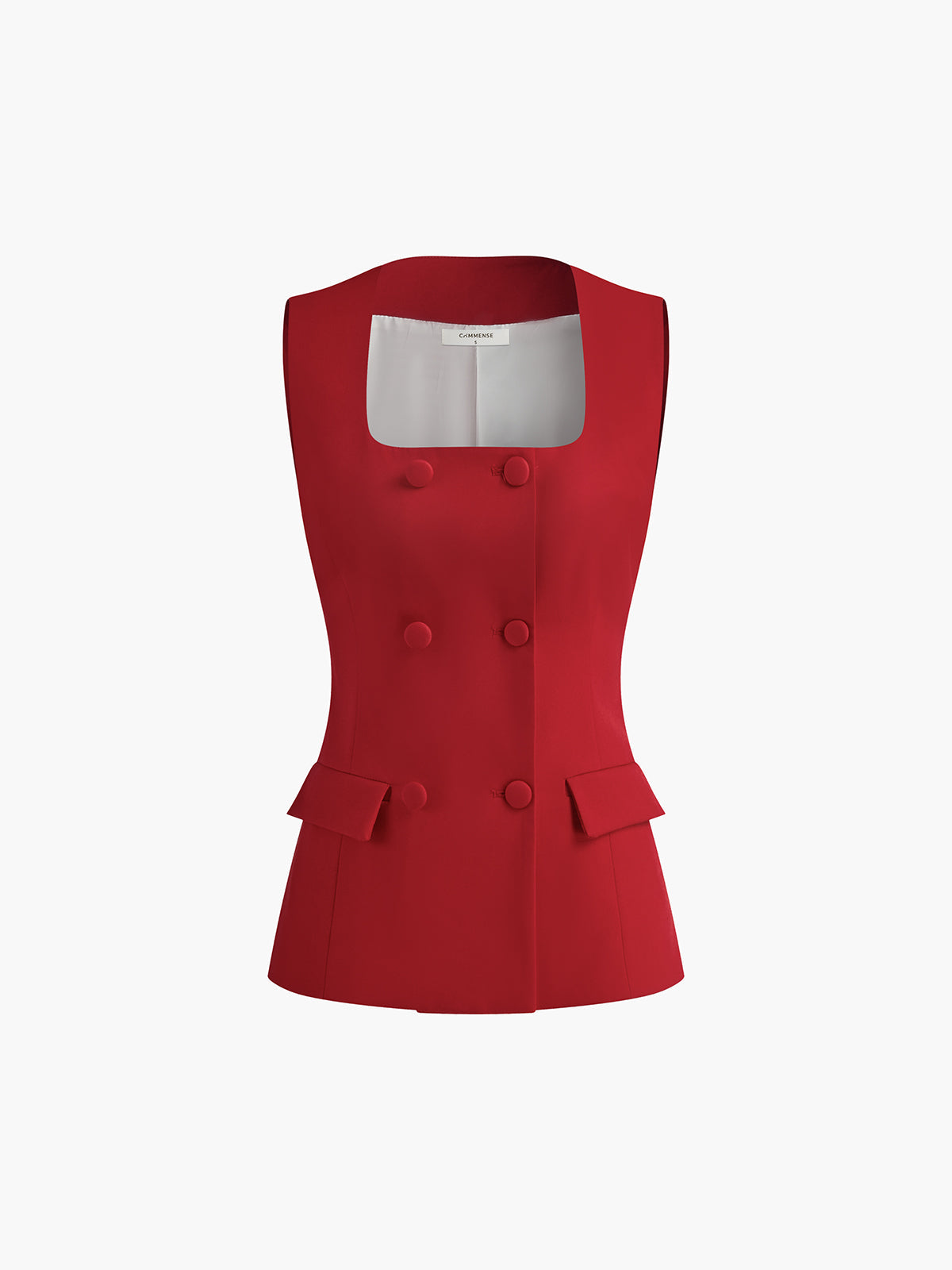Kare Yaka Düğmeli Yelek Kırmızı Zarif
